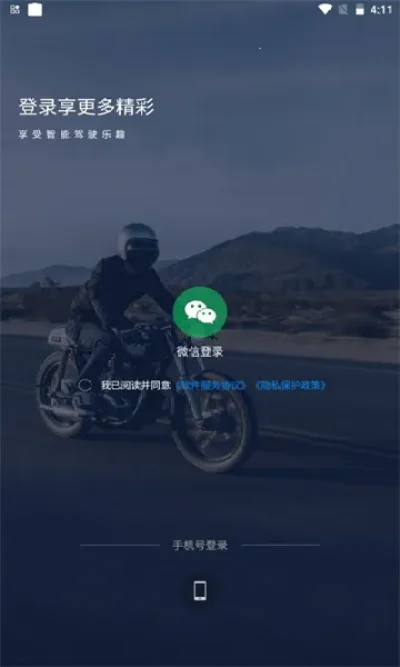 1. 从本站下载“领骑摩托最新手机版”并安装,安装完成后,使用手机号或微信号登录。登录前需打开手机蓝牙设置,将手机与摩托仪表屏连接配对。