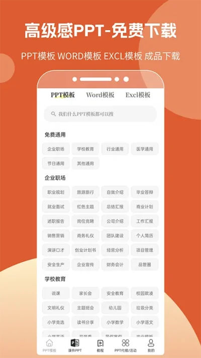 优品PPT免费模板2026手机版由优品PPT模板网打造,含各行业通用PPT模板等资源,全部免费免注册。有强大搜索功能,能在线播放浏览模板、学习制作教程,还新增AI生成文本等功能,支持多格式模板下载分享。