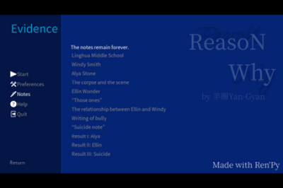 ReasoN Why是一款悬疑向视觉互动小说游戏,游戏支持简体中文以及存档进度到本地,跟随剧情的发展,解开故事的更多谜题,剧情丰富操作简单点击屏幕即可,对游戏感兴趣的话不妨点击下载吧!