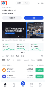 1、打开Gate.io App,登录个人账户,选择左上角的“用户中心”。