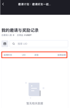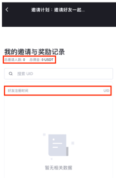 4、在“我的邀请与奖励记录”页面可以查看邀请历史中的总佣金/总邀请人数,以及被邀请人的注册时间/UID。