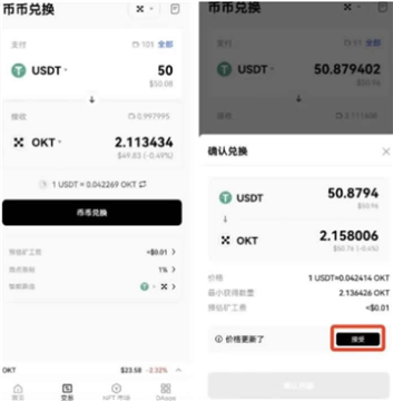 4、询价结束并完成授权后,您可点击「币币兑换」按钮发起交易,之后在二次弹窗中确认交易信息,点击「确认兑换」按钮并在钱包中确认以完成交易。此外,若此过程中交易价格发生变化,您须在二次弹窗中点击「接受」按钮接受新的报价后,点击「确认兑换」并在钱包中确认以完成交易。