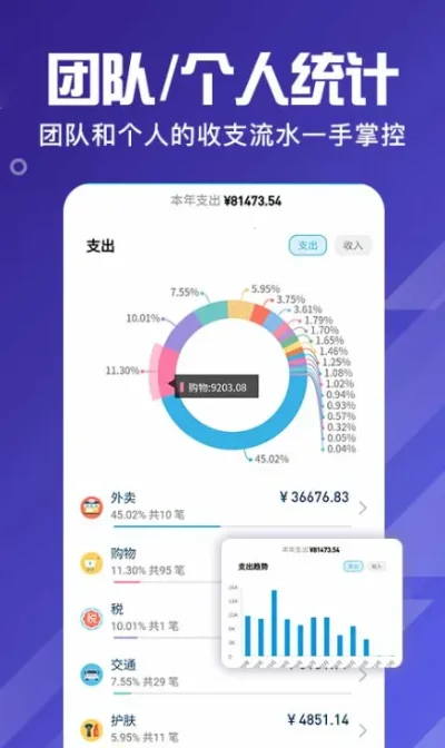 3. 多功能统计报表:能实时显示团队报表和个人报表,还可查看其他成员报表,账目情况一目了然。