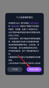 1、下载安装后打开tofai,点击同意事项进入软件