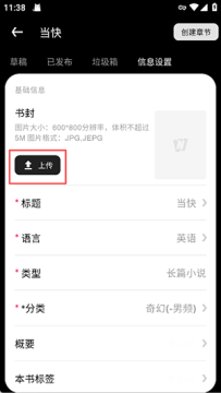 7、上传符合平台要求的封面图片,完善标题、分类等基础设置,完成后持续更新章节并发布作品,即可正式开启小说创作与收益之路。