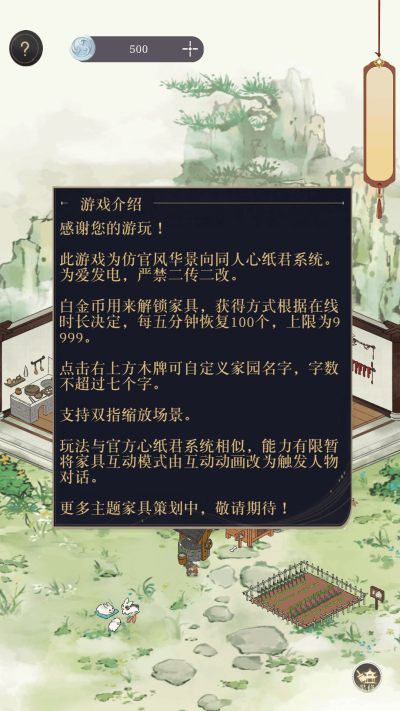 华景之家专为《代号鸢》玩家打造的剧情养成向同人自制游戏,以心纸君为核心,复刻乱世中的温情日常。游戏延续原作古风美学,聚焦男主 Q 版心纸形象,融合书信互动、家园布置、剧情探索、轻量养成四大核心玩法。