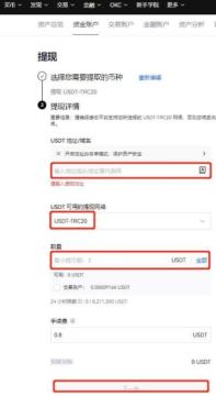 8、在提现详情提币地址处输入第5步的提现地址,提现网络选择TRC20,输入数量点击下一步(注意提现网络和充值网络需要选择一致。不然可能造成资产丢失)