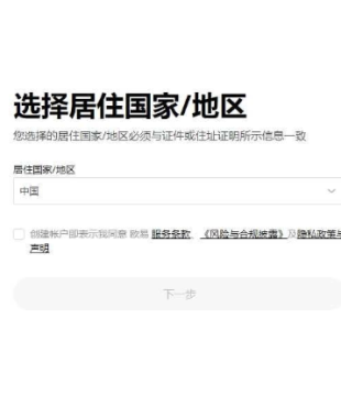 3、选择居住国家/地区,勾选服务条款、《风险与合规披露》及隐私政策与声明
