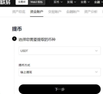7、在提现页面选择币种【USDT】,提现方式选择【链上提现】点击下一步
