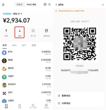 9、点击【接收】,选择转入币种,会弹出收款地址,复制地址粘贴到OK平台提币界面,便可以将数字资产成功充入Web3钱包。