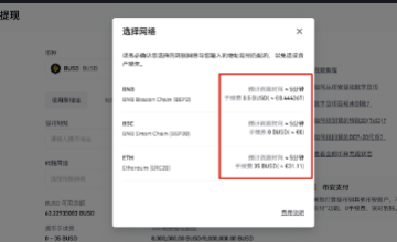 币费率因所选网络不同而不同。 换言之,所需的提现数量和手续费将根据您所选的区块网络而变化。在此示例中,我们有BEP20 BNB Smart Chain (BSC)(原币安智能链 Binance Smart Chain),BEP2 BNB Beacon Chain(原币安链 Binance Chain)(币安链)和ERC20(以太坊)三种选择。