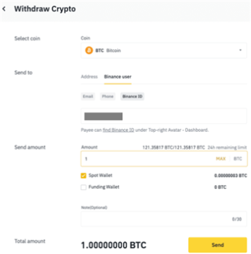 4. 通过币安 ID (BUID)、邮箱或电话号转账:在【提币地址】字段下,选择【币安用户】,然后选择转账方式并输入收款人的相关信息。核对转账金额,并确保收款人信息正确无误。然后,点击【转账】继续操作。