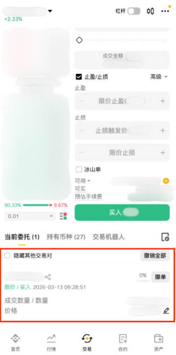 交易区提供限价单、市价单、止盈止损等多样化订单类型,输入数量与价格后一键下单,支持部分成交自动撤销(FOK)等高级策略。