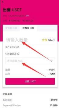 6、找到心仪价格的收购商,点击出售,在出售界面填写好需要变现的USDT数量,并选择好你的收款方式(注意:在自选区界面,每个收购商的下方都会有支持的收款方式,出售的时候最好选择支持你自己收款方式的商户出售)。