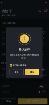 7、完成匹配以后,坐等收款,当然对方打款以后,需要你确认收款,并放币给对方,如果现金没有到帐并且对方确认了订单,那么一定要选择申诉通过客服处理,收到款以后要在指定时间内放行,不然会有冻结账户的风险。