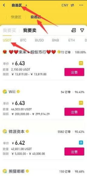 4、进入c2c版块后,点击上方箭头,选择自选区,选择我要卖,下方出售币种选择USDT(其它币种同操作)。