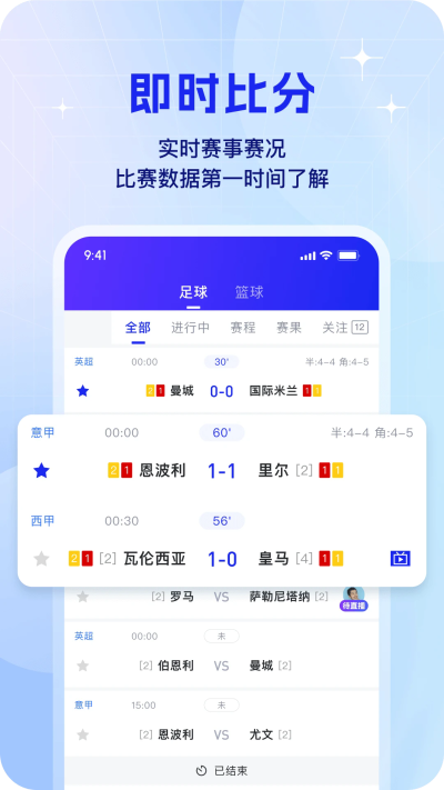 【即时比分】足球篮球网球比分实时更新,无需守在视频直播前,即可快速了解多场足球篮球比赛的实时赛况、比赛结果等信息。