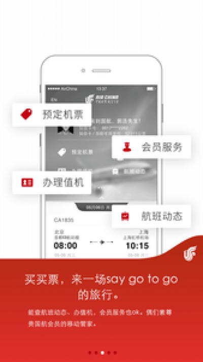 出行管家、特价机票、办理乘机、航班动态、凤凰知音、自助改期等简便操作随时随心,贴身服务尽善尽美。还有中、英文双语可供选择。