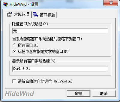 可设置系统启动时是否自动运行 HideWnd(注:该项功能将会修改系统注册表)。