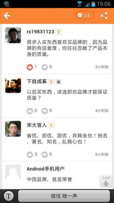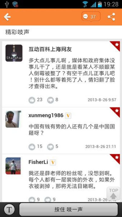对于每个观察,用户可以通过文字评论,或者语音评论的方式来发表自己的见解,其中,语音评论需要用户注册登录后才能发表。这些评论,也会时时同步在互动百科官网上,以达到互动百科web端与移动端紧密结合,营造良好的社区氛围的目的。对于用户发的评论,其他用户也可以参与互动,即进行“声援”、“声讨”来表达自己的观点。