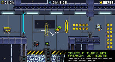 喷射霸王龙是由TreeFortress Games制作发行的一款横版过关游戏,游戏讲述的是一只生活在中生代时期的霸王龙获得了一双外星人的强力弹跳靴。靠着这双靴子的惊人弹跳力越过一个又一个的障碍直到冲向下一个星球,确保自己不会被灭绝。虽然剧情来看比较幼稚,不过还是挺好玩的。