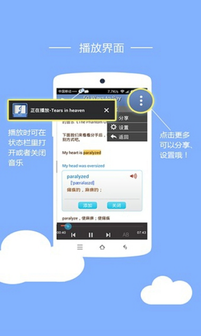 听歌学英语为了帮助大家能在一个轻松、欢快的环境下学习英语,尤其是提高英语的听读能力,爱语吧针对经典欧美老歌开发看此应用,让大家在回味原汁原味地经典欧美歌曲的同时,快乐学习英语词汇,语法,用法,在听经典的同时全面提升听力、词汇量等!