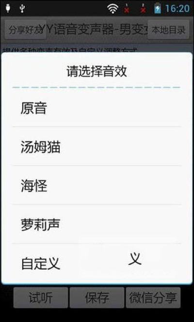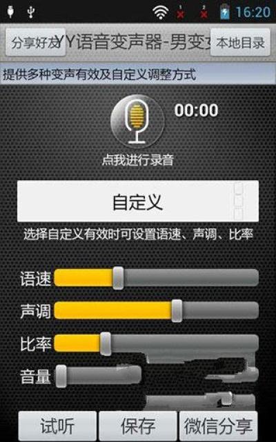 yy语音变声器男变女是一款运行在android平台上的手机yy变声器,该软件可以自行设定原音、汤姆、海怪、萝莉声等音效,自行调整语速、声调、比率和音量,帮助用户将男声变成女声,让你使用yy语音时轻松调成女声,恶搞你的网友和好友,但请不要做非法事情,否则后果自负。