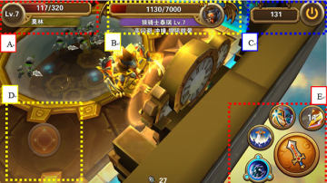 E区域-战斗区:1.外围的按钮从左至右分别是:翻滚、技能1、技能2、技能3;2.右下角按钮是普通攻击按钮