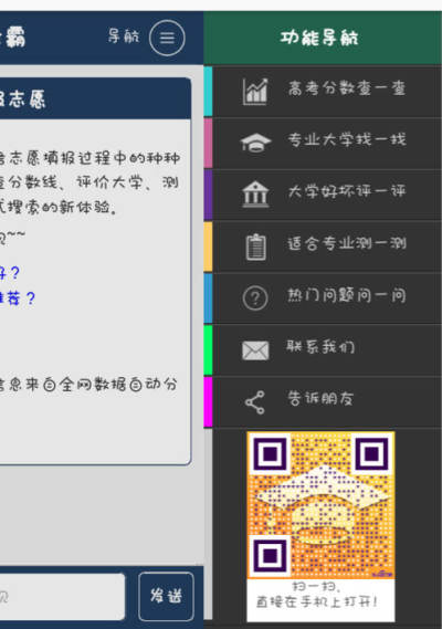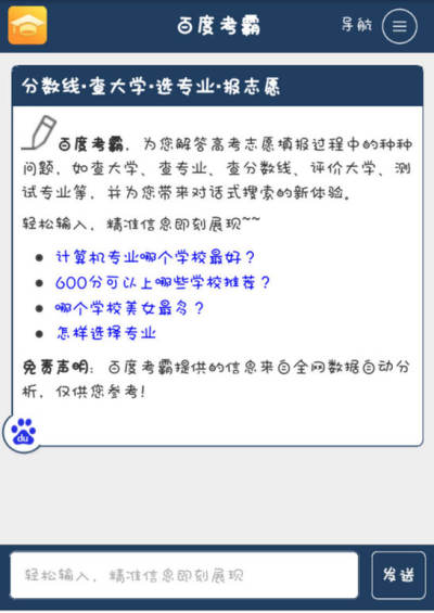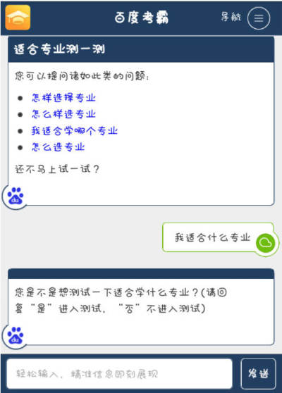 很多的高考考生在填报志愿时其实并不清楚自己适合学什么专业,所以往往是听从老师家长的意见、或者简单的依据当前社会上什么专业热门。然而,这样很容易导致考生们“入错行”,即学习一个自己不喜欢的专业,毕业后从事自己不擅长的工作,甚至不得不换到一个专业完全不对口的行业。为此,百度考霸提供了“适合专业测一测”的功能,就是为了帮助考生量身选择最适合自己的专业。用户只需要简单回答10轮以内的测试问题,如“性别”、“文理科”、“擅长的科目”、“理想的职业”等,便可以轻松得到百度考霸为其自动推荐的专业列表。本功能虽看似低调,但测过的用户都连呼“好准”。这主要得益于百度考霸背后强大的数据挖掘能力和机器学习模型。