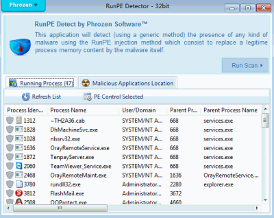 Phrozen RunPE Detector是一个免费的工具,扫描你的头在记忆过程,并比较他们的磁盘映像。这听起来太简单的技术,但它确实工作:如果一个进程已经被runpe然后应该有区别,你会看到一个警告。