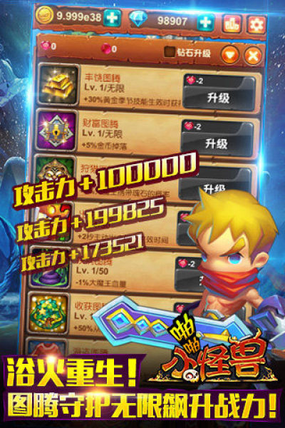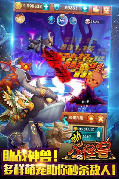 如果玩家非常随意的去升级宠物与神器那么很快就容易碰到难以逾越的BOSS关卡,单纯的点击可不是游戏的乐趣所在。考虑升级神器的顺序,合理的分配小怪兽们掉落的金钱才是真正要考虑的问题。