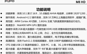 品铂PiPO M8HD(16GB/3G版)搭载了RK3188 ARM Cortex-A9四核处理器,主频1.6GHz,内置Mail-400图形处理器,拥有2GB内存,强悍的性能表现使得主流游戏和应用可谓毫无压力。