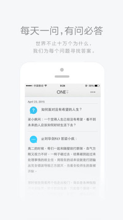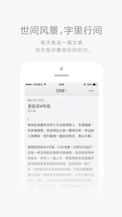 这款one一个手机软件是由大家所熟知的韩寒主编的文艺电子读物,这里每天都会为读者推荐一篇好文章或是一组好图片,同时大家每天还可以在线提出一个问题,会有最专业的老师为大家解答,平时喜欢阅读的朋友可以来体验一下它的独特之风!