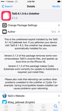 一般来说,越狱更新包会先在电脑端放出,一段时间后才会被更新到 Cydia 内,V2.1.3 工具似乎已经得到了 saurik 的同意,目前已经登陆 Cydia 的默认源 Telesphoreo,这意味着用户刷新 Cydia,就可以在更新一栏中看到太极的更新工具包。