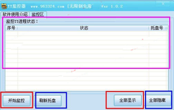 2、下面的图是监控区,点击开始监控,多开的yy状态就会出现在监控区,同时可以刷新托盘,以及全部显示和全部隐藏功能。