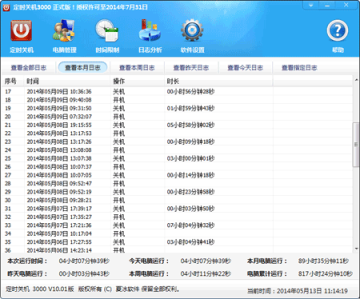 电脑开关机日志分析可以详细的对电脑的每次开机时间,关机时间和电脑每次开机多长时间进行分析统计并且可以查看电脑的每次开机和关机记录。您可以查看电脑当前运行多长时间,今天累计运行多长时间、昨天累计运行多长时间、本周累计运行多长时间、本月累计运行多长时间和电脑累计运行多长时间。您还可以查看全部时间、本月、本周、昨天、今天和指定时间段的开机和关机记录。