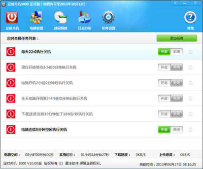 13种执行操作;1 电脑关机。2 电脑重启。3 电脑注销当前用户。4 系统锁定。5 电脑睡眠。6 提醒。7 关闭显示器。8 电脑待机。9 运行软件。10 打开文件。11 打开网址。12 关闭软件。13 系统垃圾清理。并且可以设置任务开机自动启动和同时执行多项任务。