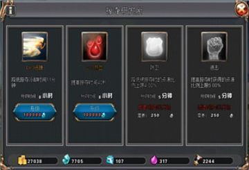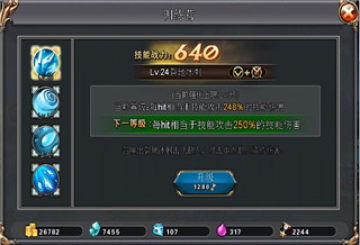 界面里有角色技能列表,技能战力,技能释放手势及技能详细描述。升级技能需要使用军功,军功可通过副本、抽宝箱等方式获得