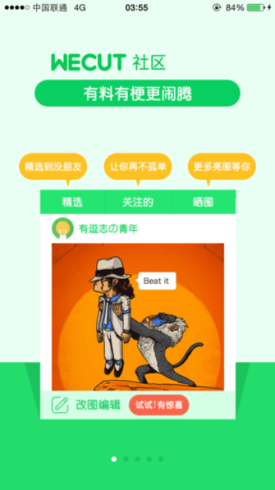 Wecut是手机上一款非常好用的图片处理类软件,软件主要功能就是剪贴抠图,不过你可以邀请好友一起来处理你的图片,一起合伙玩转(huai)图片。