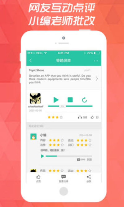 【互动点评】:小编和网友相互点评口语录音打分,让你知己知彼,组团屠鸭更有动力;
