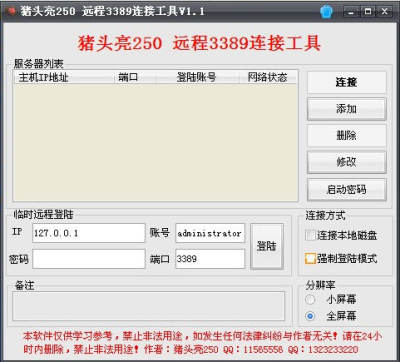 下班回家之后发现有些工作没有处理好需要在公司的电脑上操作该怎么办呢?猪头亮250远程3389连接工具可以轻松帮助你实现临时远程登陆,有连接本地磁盘和强制登录模式两种连接方式,支持大小屏幕分辨率的设置。使用简单,绿色安全,欢迎有需要的朋友下载试用!