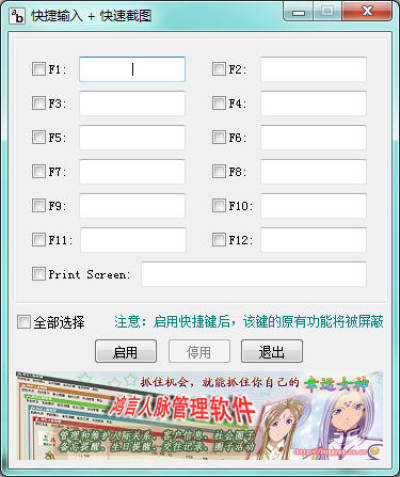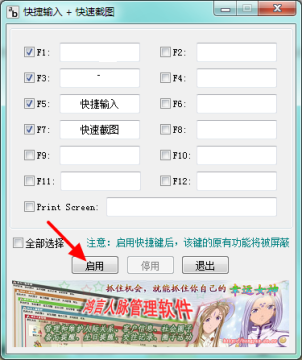 设置方法:先选择快捷键(F1到F12),设置对应的文本内容。点击启用按钮开启快捷键,不用的时候点击停用按钮取消快捷键。这些快捷键需要在文本编辑器中使用,比如记事本、Word、文本框等等。