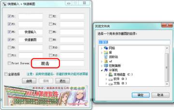 设置方法:选择[Print Screen],在弹出的浏览文件夹窗口中选择需要保存截图的目录,或者双击右侧的文本框选择目录。然后点击启用按钮开启快捷键,不用的时候点击停用按钮取消快捷键。