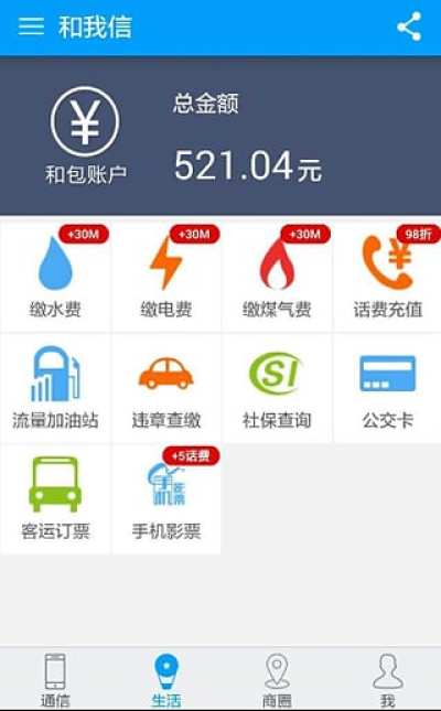 “和我信”是一款基于手机号的一站式服务应用。它不仅能为个人提供缴话费、赚流量等通信服务,还能一号绑定水电气、社保、公交卡、车牌号实现各类生活服务查缴,一键搜索出你常去商圈的各类优惠折扣,一揽子解决个人应用、视频、通讯录等数据备份难题。