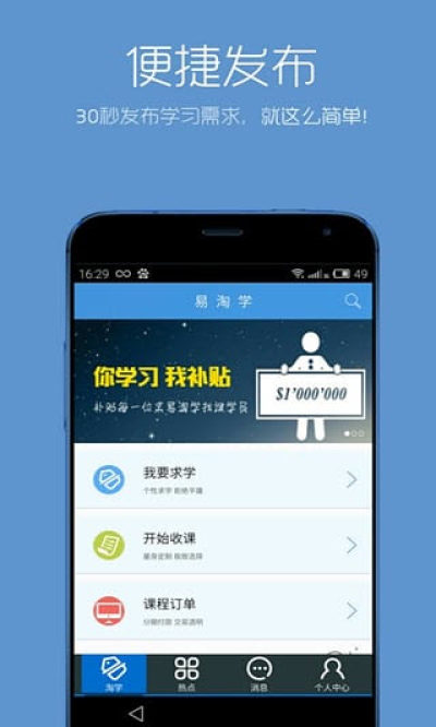 易淘学是一款手机在线学习软件,同学们可以在这里先提出问题试听,然后再选中自己喜欢的老师,他会为我们一对一量身定制所有教学课程,最有效地为我们的学习提供帮助,有需要的朋友快来下载体验吧!