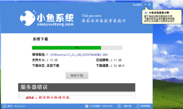 第三步、软件开始下载你所选定的系统Ghost,从界面上可以清晰明了地观察到各种数据。小鱼系统提供高达10多兆每秒的瞬时下载速度,当然根据每个用户终端的网络带宽不同会有很大差异,请大家在下载过程中耐心等待;