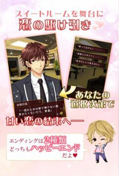本作品,是以前在「GREE」上配信过《恋爱HOTEL~秘密的房间服务》(2013年8月结束),现在作为手机应用被重制。每天不用钱就能的玩5个故事场景。另外,攻略人物对象,有代表日本的IT企业的领袖人物的超凡魅力社长,畅销小说接二连三的人气作家,让人脸红心跳的的实力派人气演员,房地产集团的名门子弟,酒店集团的下期继承者的5人。