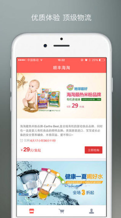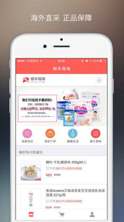 顺丰海淘是一个专门为中国国内消费者打造的海外购物平台,网站专营各类海外热销产品,利用顺丰速运在国际运输与贸易上的优势,为消费者提供实惠、高品质的服务体验,全程做到让用户放心,购物省心。顺丰海淘整合了国际仓储及物流、跨国支付等各种资源,让用户可以一键式下单,轻轻松松购买到心仪价优的海外商品。