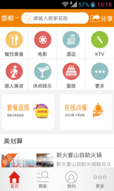 1.首页:滚动展示美划算最新动态,通过商家的分类图片,可以快速进入特定分类的商家,首页中也展示了热门商家与最新商家;