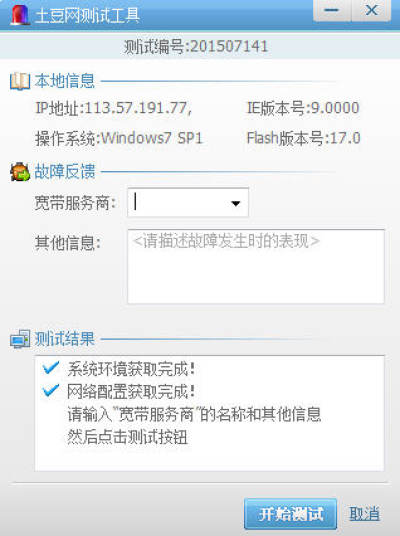 步骤一:选择“宽带服务商”步骤二:填写“其他信息”步骤三:点击“开始测试”步骤四:最后将“测试编码”记录下来,在向土豆客服描述你所遇到的情况时,有了“测试编码”可帮助土豆技术查找定位问题。